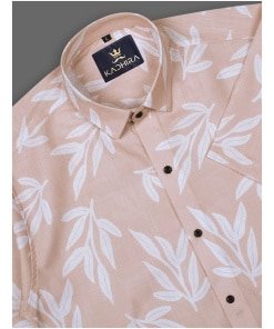 This shirt is a fusion of style and tropical bliss, making it the perfect choice for any festive occasion. The peachy tones evoke a sense of warmth and joy, while the botanical leaf print adds a touch of exotic flair, creating an ensemble that’s both captivating and comfortable.