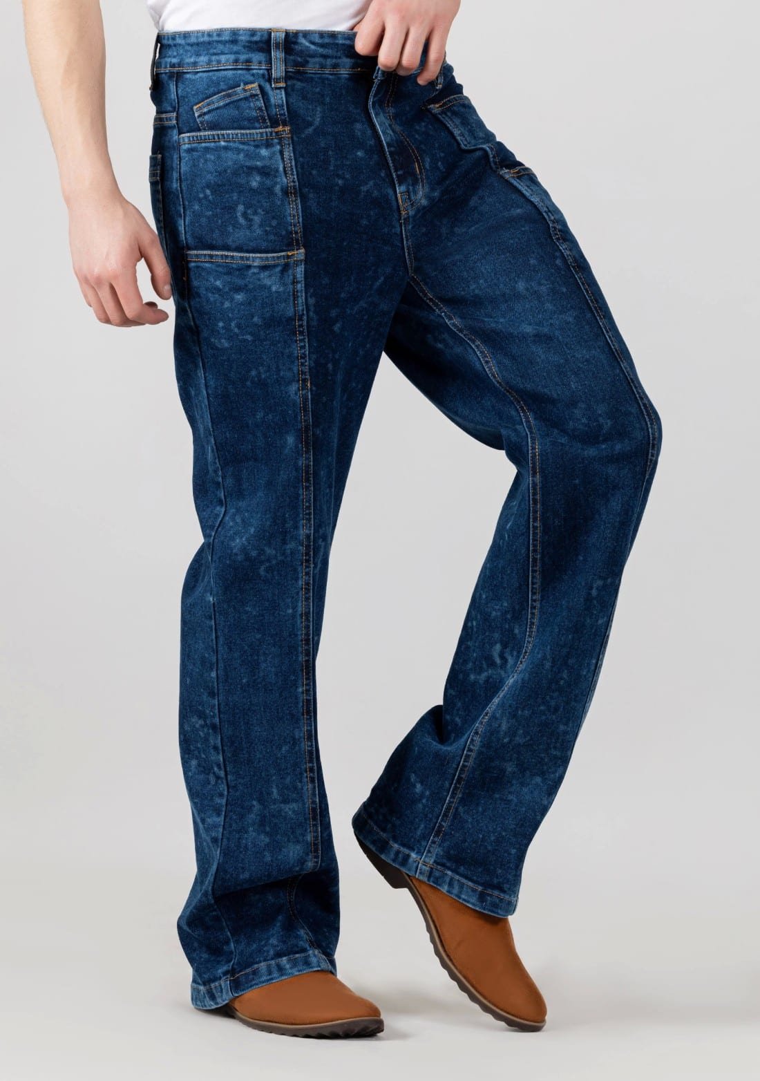 Blue Wide Leg Cut and Sew Men’s Jeans, where classic meets contemporary in a seamless fusion of style and comfort. Crafted with meticulous attention to detail, these jeans redefine casual sophistication with a modern edge.
