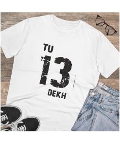 Crafted from premium PC cotton, this T-shirt ensures a soft and breathable feel against your skin, providing comfort throughout the day. The classic white hue serves as a versatile backdrop for the humorous “Tu 13 Dekh” print, adding a lighthearted and conversational element to your ensemble.