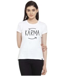 White “Karma” Printed Cotton Blend Women’s T-Shirt – a stylish and philosophical addition to your wardrobe that seamlessly blends comfort with positive vibes. Elevate your fashion game with this trendy and empowering tee designed for the modern woman.